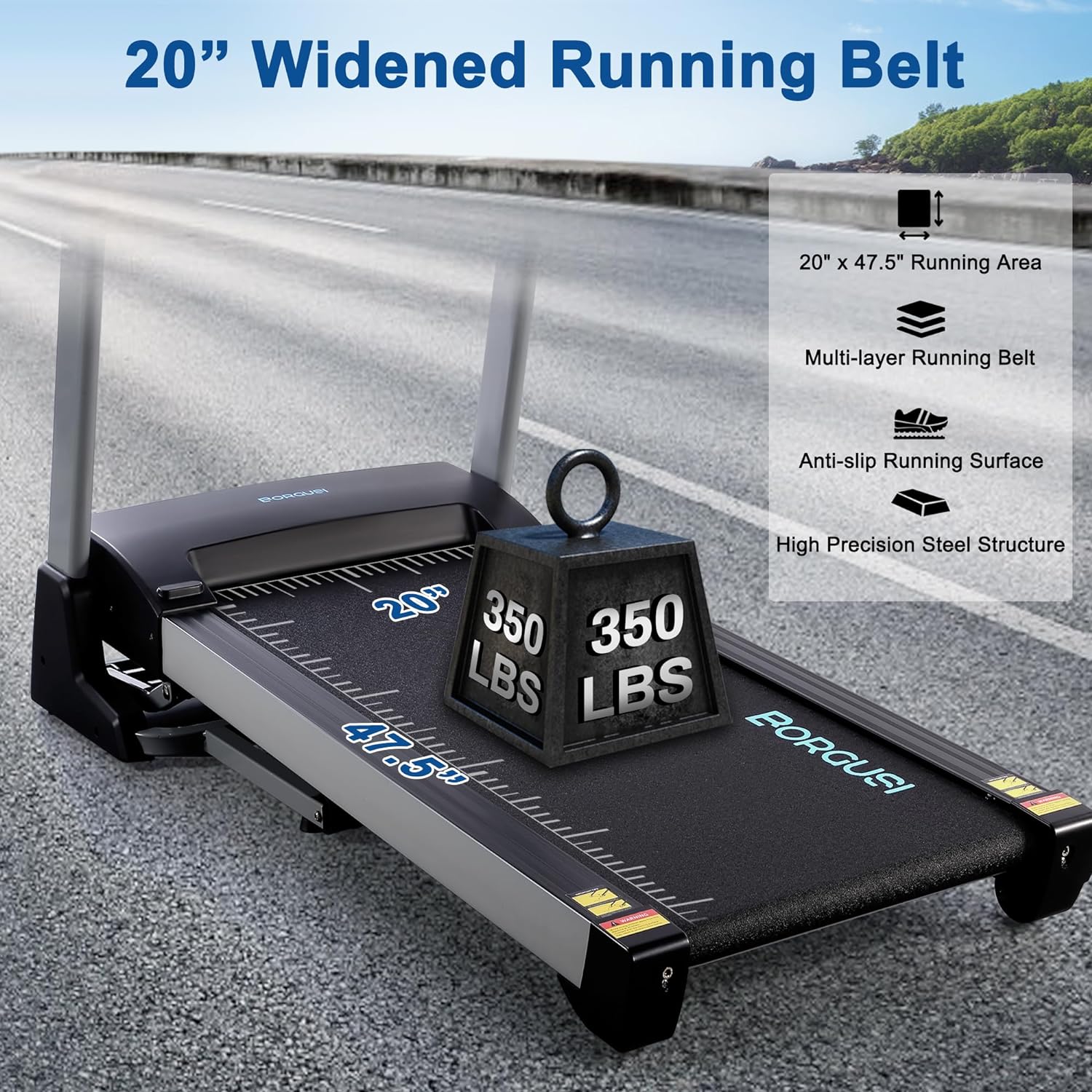 BORGUSI 15% Auto Incline Treadmill with 20" Wide Tread Belt, 350 LBS Capacity, 3.5 HP, Speeds Up to 10 MPH, Folding Treadmill with 15 Preset Programs LCD Display