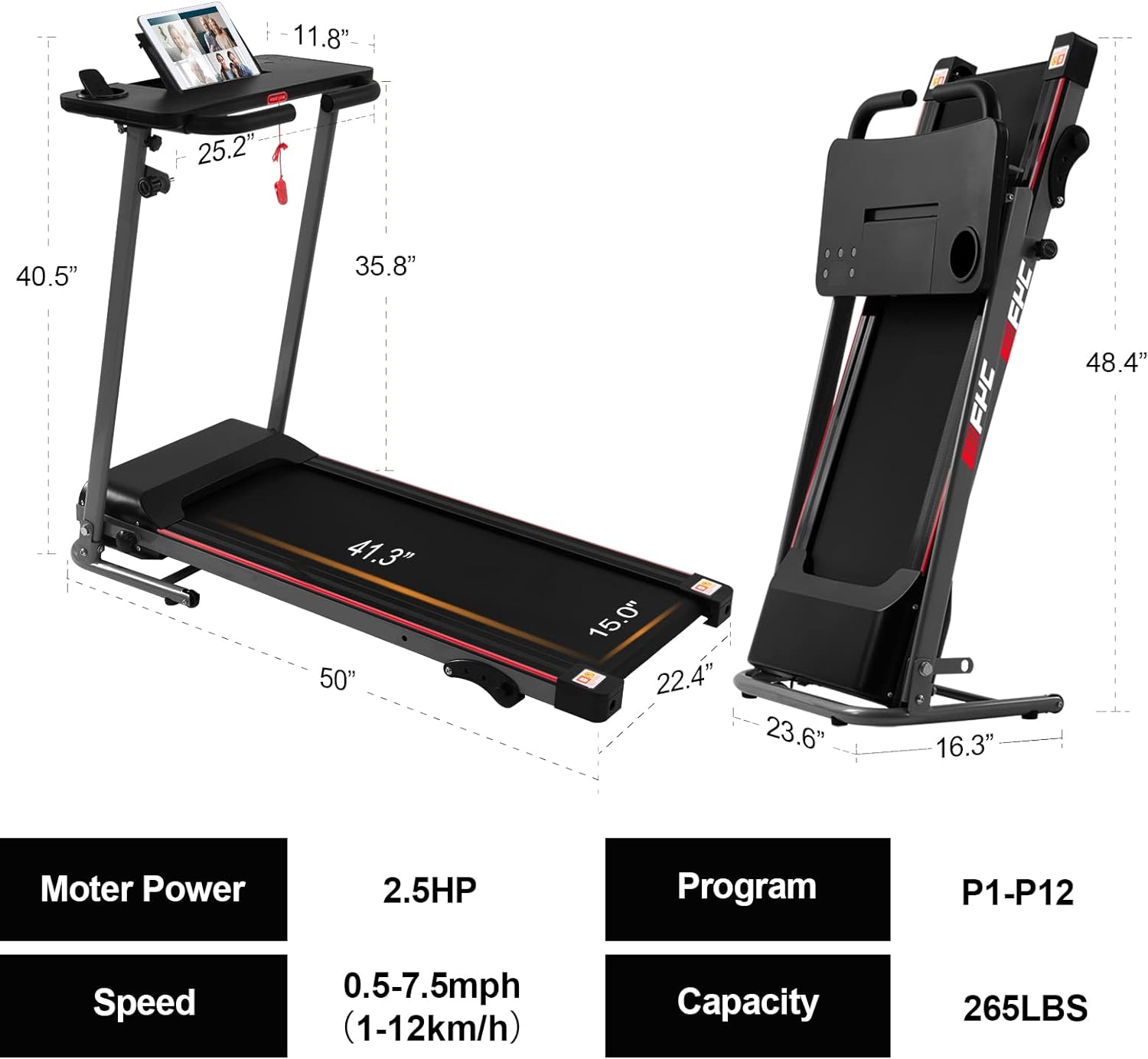 Modern Folding Treadmill for Home with Desk - 2.5HP Compact Electric Treadmill for Running and Walking Foldable Portable Running Machine for Small Spaces Workout, 265LBS Weight Capacity